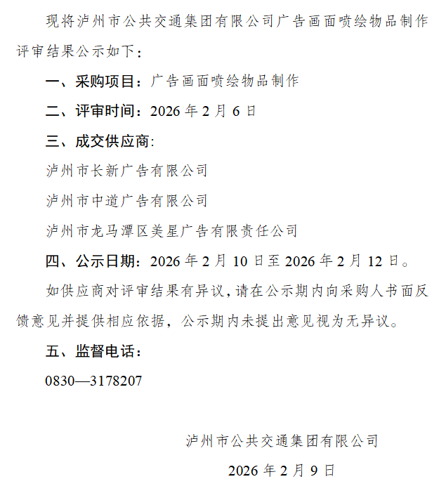 瀘州市公共交通集團(tuán)有限公司廣告畫面噴繪物品制作評(píng)審結(jié)果公示